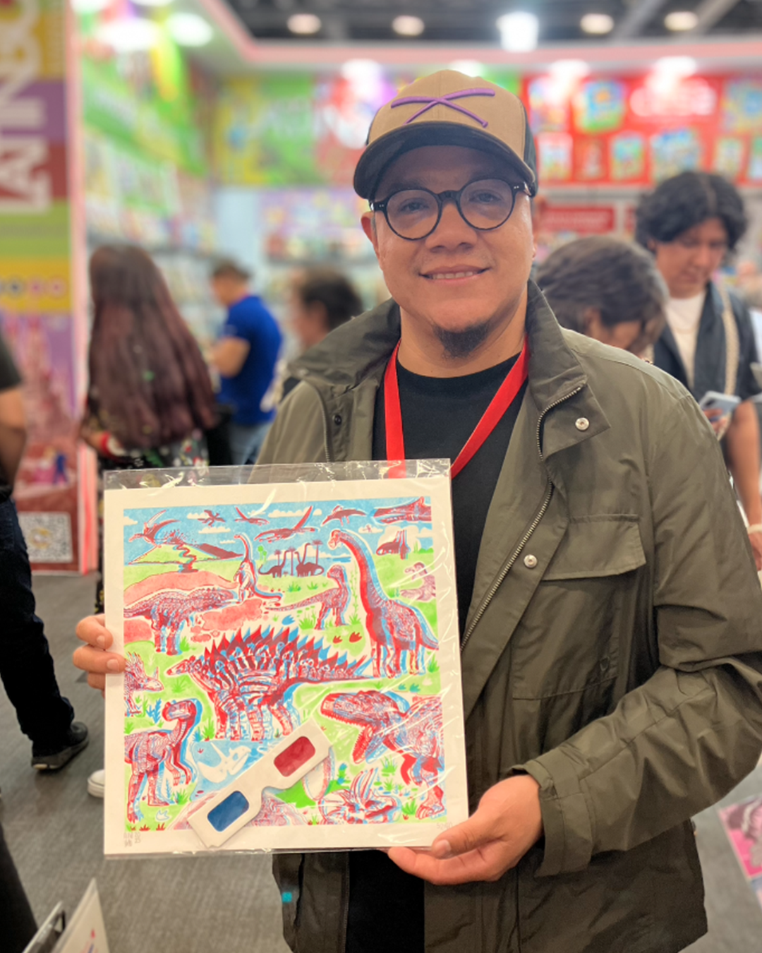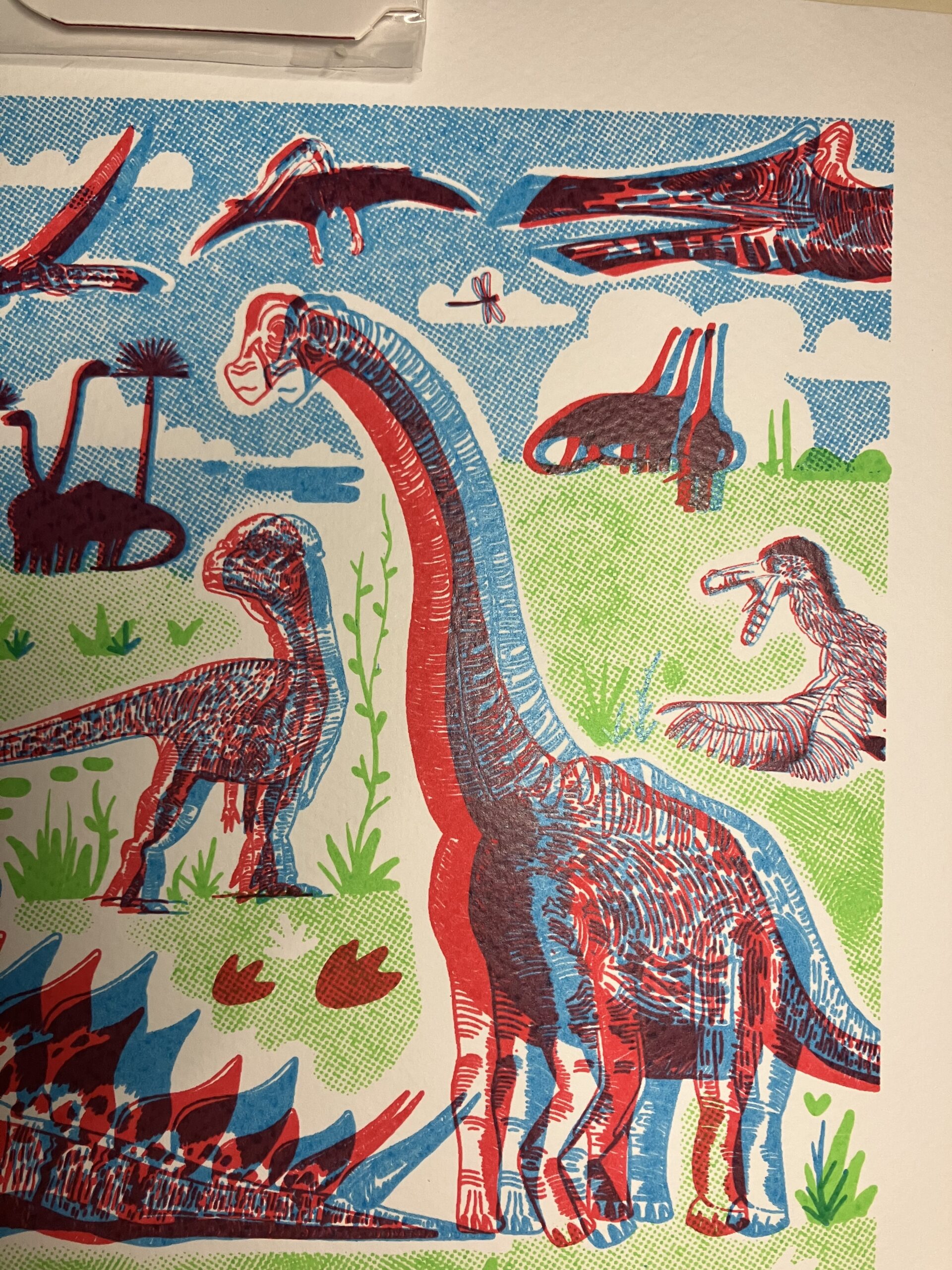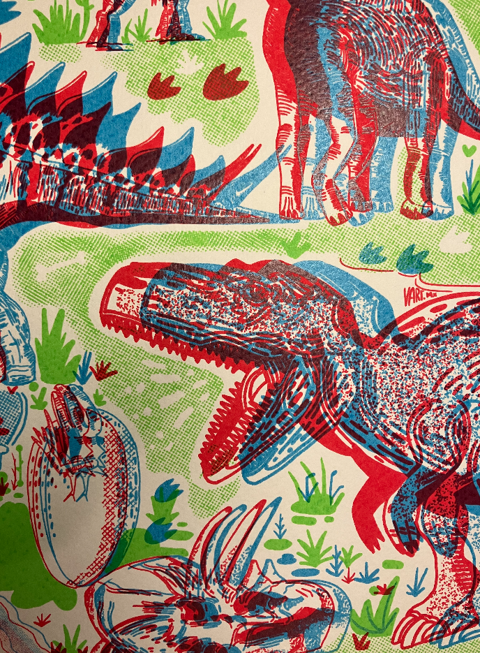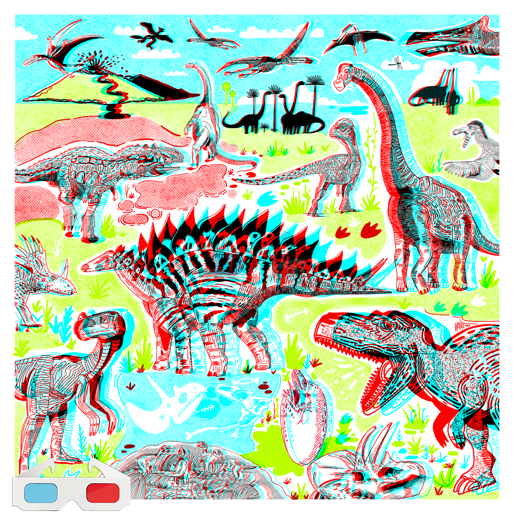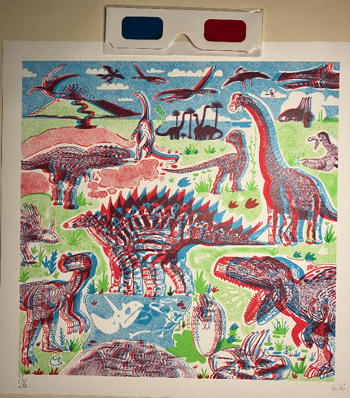The Dinos 3D version cuadrada de disco de vinil 31 cm x 31 cm Serigrafia a 3 tintas impreso en papel Fabriano de algodón por el taller de 75 grados. Edición Limitada a 60 piezas incluye lentes de cartón 3D y sticker de regalo. Brilla la tinta verde con luz negra.